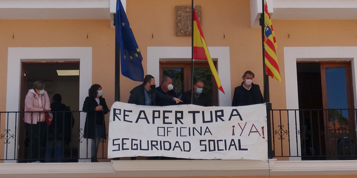 En un acto que ha congregado alcaldes, concejales y representantes de Asociaciones y sindicatos celebrado en la plaza del Ayuntamiento de Utrillas, se ha puesto una pancarta en el balcón del consistorio minero reivindicando la reapertura de la oficina de la Seguridad Social sin servicio desde hace 108 días.