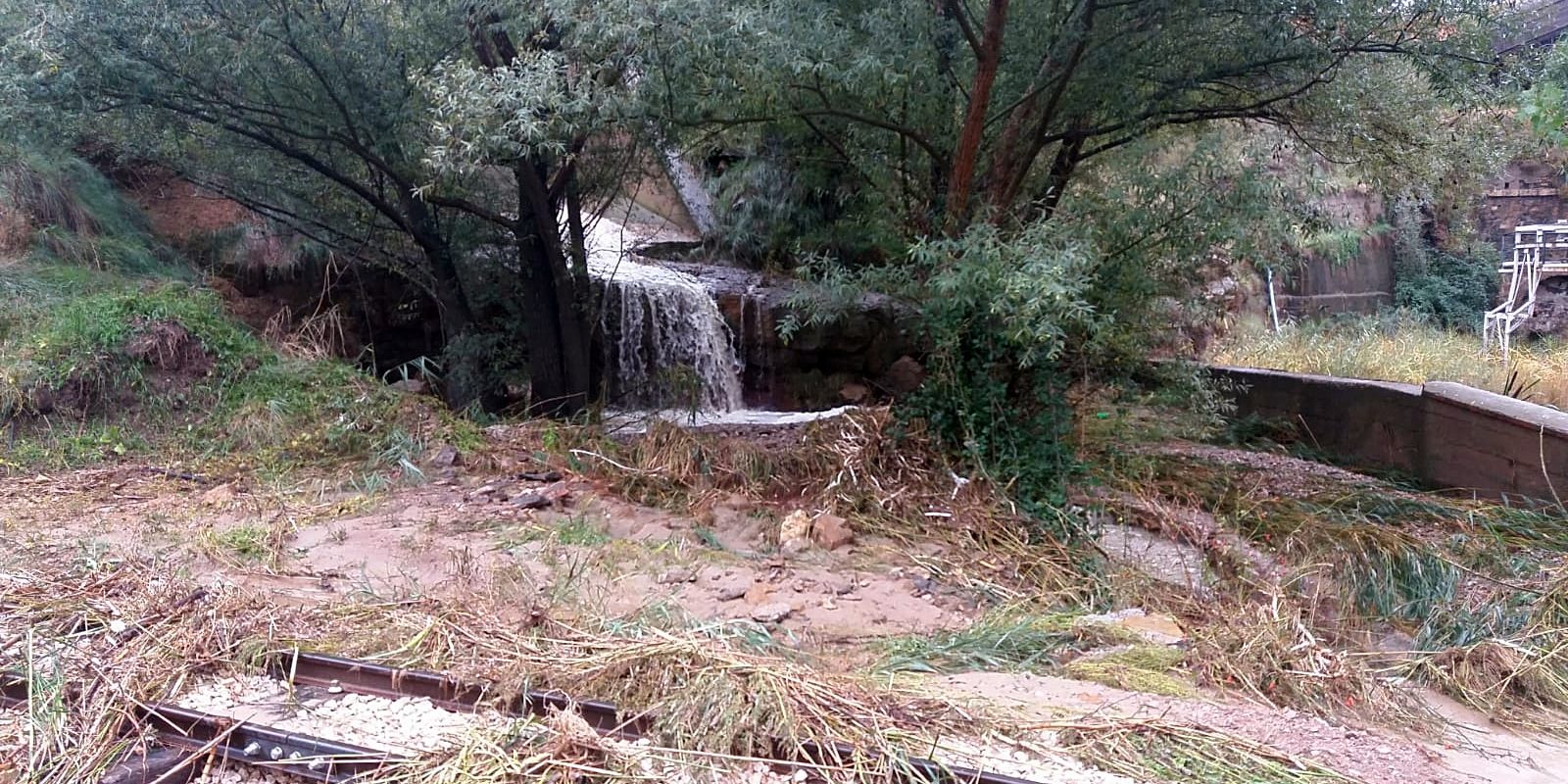 Los 150 litros por metro cuadrado de agua acumulados en estos días, han sido suficientes para provocar daños en el colector municipal que conduce las aguas fecales a la depuradora, desprendimientos de rocas cercanas a la carretera nacional y desperfectos en el Parque Temático de la Minería y el Ferrocarril, sobre todo en el trazado de la vía de tren donde los arrastres del agua han arrancado el balasto sobre el que apoyan las traviesas de la vía del tren.